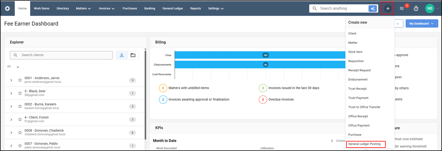 1. Select the + icon in the top right menu, then select General Ledger Posting.