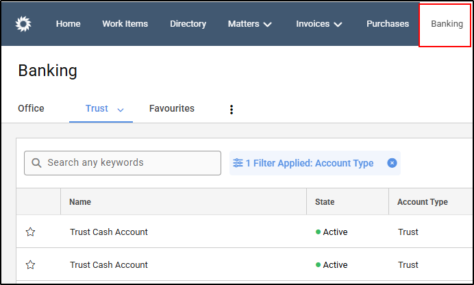 There are two ways to access the Client/Trust Cash Account, the first is via the Accountant Dashboard and the second via the Banking drop-down on the main navigation menu bar. The following steps will go through each option.
