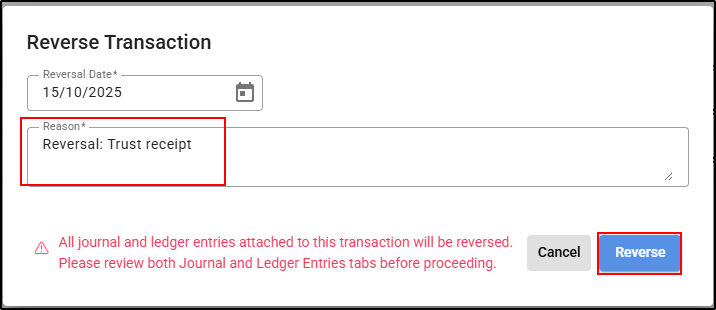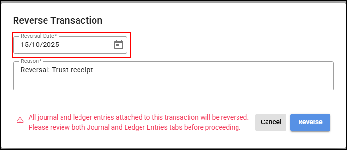 4. In the pop-up screen, the Reversal Date will default to the original posting date of the receipt.