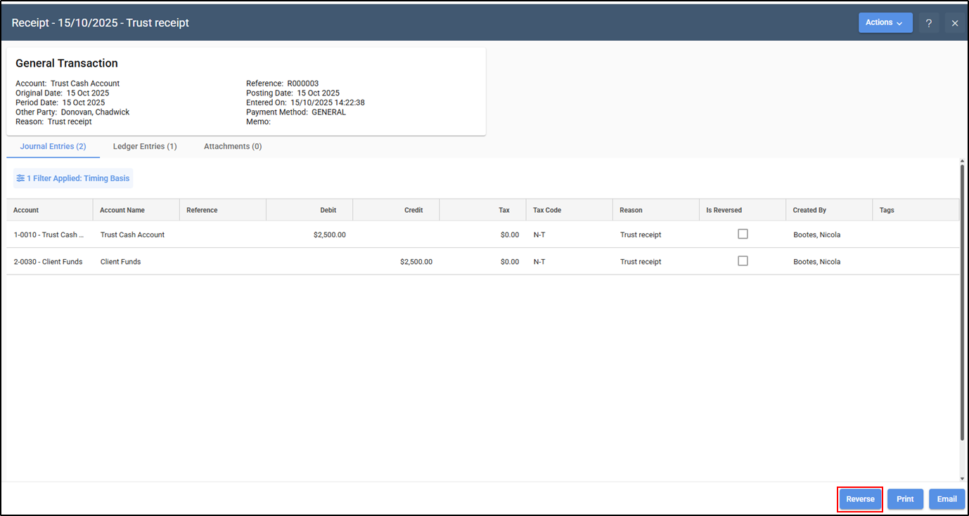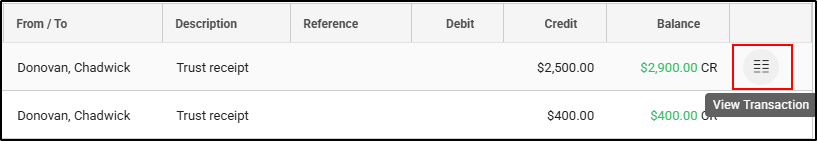 4. Click on the ledger symbol to the right of the client receipt entry which needs to be reversed.