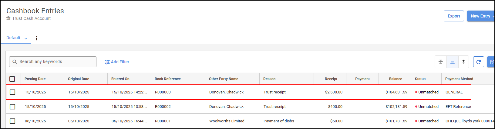 2. Find the relevant payment transaction in the Cashbook Entries list. Click on the entry to open the transaction.