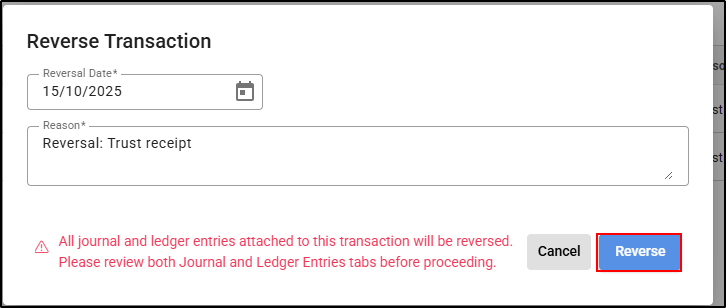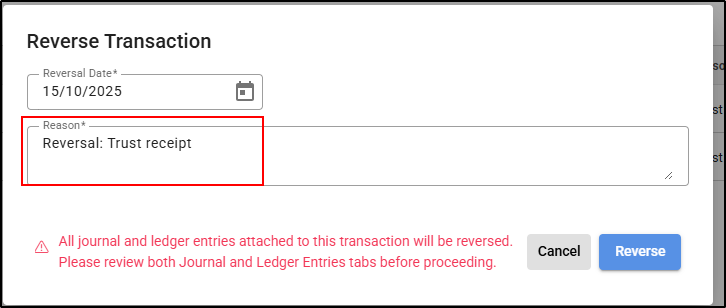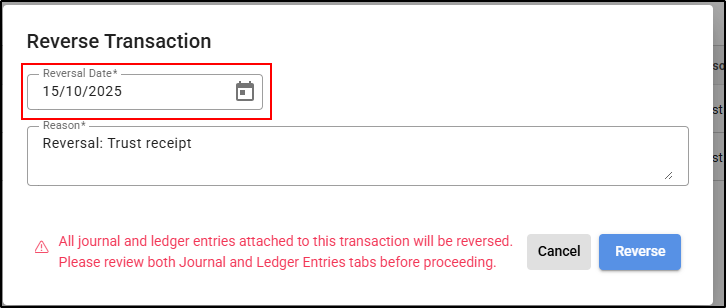 4. The Reversal Date will default to the original transaction date but can be amended if necessary by typing or selecting a date from the calendar.